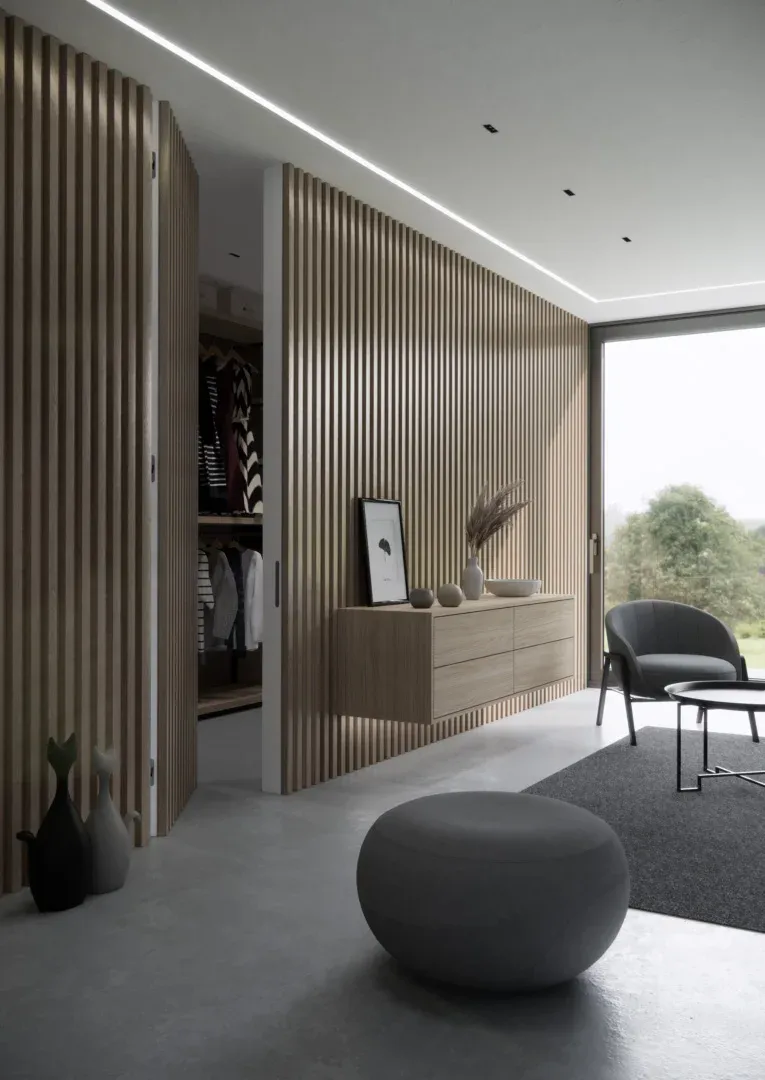 L’alto valore estetico delle verniciature materiche di KROMOSS è enfatizzato dal taglio netto dei profili Kover che con il loro spigolo vivo accentuano le ombre delle boiserie e dei rivestimenti